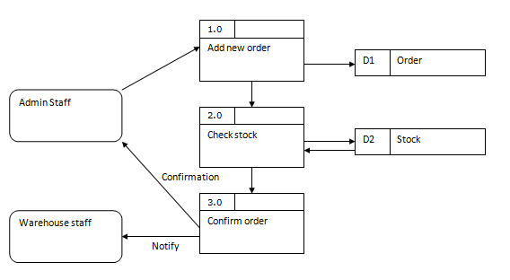 Data flow diagrams, or DFD's, show how information will get processed in a new system. Two advantages DFD's have over flow charts are - 1 DFD's can be broken down into multiple levels. 2. They show the distinction of internal and external parts of the system. There are three main symbols on a DFD- External entities represent anything from outside the system to be modeled. This tends to be some form of human input but could be anything such as a sensor or another separate system. Sometimes other external entities need to be involved in a data flow and these should be represented on the diagram, such as letting the warehouse staff know that a new order has been made. Internal process are where something is done with the input given. Add new order, for example, will save the order to the database as well as possibly validating the input. All processing which occurs will tend to happen in a internal process. A data store represents the database or anything else we can store data in such as a file. It is common on DFDs to only put return arrows if data, other than if the transaction was successful, is returned. The flow of data is shown via arrows. You can add a label to the arrow if you wish to express something such as the type or nature of the data to flow. If the flow is obvious then it is better to leave it blank so the diagram does not become cluttered.