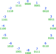 We are using 4 bit's to represent a number, as such this is the complete list of all numbers represent able by a 4 bit binary number. From 0 to 7, you should notice, that they are in the notation we are already used to. There should be no issues to retrieve the decimal value from these binary numbers. The main difference is how we represent negative numbers. What we do is start off with the binary number 1111, which is used to represent -1. We then count backwards until we get to 1000. The diagram on the next page shows how the binary numbers progress from 0000 to 1111. This may seem a bit strange, so let's look at it in a bit more detail. If we convert a binary number 1111 into decimal, using the normal system, we get the decimal number 15. This is where we are going to start counting backwards from. We know that 1111 represents -1 and to get the next number we must count backwards. 15 - 1 = 14 Binary representation of 14 = 1110 If we compare this to our table and the diagram we see that 1110 represents -2. To get -3 we subtract 1 from 1110 or 14 which is 1101 or 13.