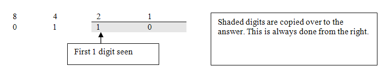 We have seen how two's complement can be used to represent negative numbers. We now need to look at how we can convert a positive number into a negative. Let's start off with an example, to convert 6 to -6. First of all we write down the binary representation of 6. The numbers in the top row represent the column values for each binary digit. So 4 + 2 = 6. Starting from the right, we copy all of the binary digits until we see a 1 as shown in the diagram above. These are then copied over to the answer. In this case we copy over the bits 10, as this is the first 1 bit we read in from the right hand side. Finally we simply complement, or flip the bits, of the rest.