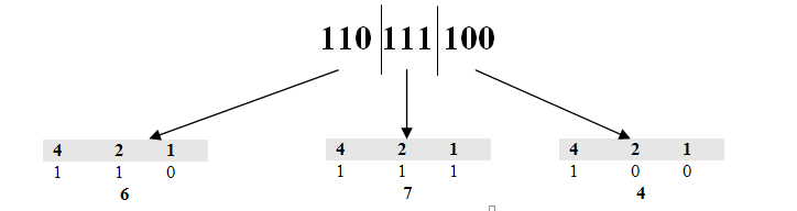 Octal is to the base 8. This means that a single digit can store 8 separate values (0,1,2,3,4,5,6 and 7). It does have its limited uses within computers but for the most part hexadecimal or binary is used. It takes three bits to store a single octal digital which is different from hexadecimal which uses 4 bits. Let's consider the following 9 bit example This gives us the result of 674 in octal. The process to convert to octal is very straight forward. You split the binary up into groups of 3 bits (starting from the right always). You then convert each group of 3 bits into denary. This will then give you the final octal answer. A common mistake is to add up the results of this (so 6 + 7 + 4 = 17). However this is incorrect |
