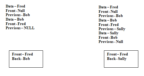 In order to make a queue work we need to store the start of the queue and also each node must store the previous node. This is almost identical to the stack. However we also need to store where the end of the queue is as well. Although this is not necessary it does improve performance. The end of the queue can always be found by starting at the front of the queue and keep going until you find the end. However this may take a long time is the queue is large. It is must simpler to go straight to the end of the queue and this is how we know as humans queues work. People normally get a bit upset if you try and join the front of the queue.
