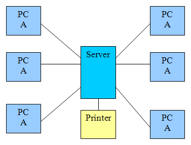 The star network is the more resilient of the three topologies introduced in this course. Essentially all PC's are connected to a single server or router. Each will have a single cable running from the PC to the server. This means that if a cable breaks then only one PC will be effected. This is different to the other networks which would completely fail if any of the cables should break. It does fail if the server goes down. However having a spare server ready to kick in would solve this problem. Backup servers are common in networks which need to be highly available such as banking network or googles network. Below is a diagram of a star network. A printer has been added to the diagram to show that it is not just PC's which can be networked. In most schools, colleges, universities, companies and even homes printers will be connected to the network so they can be accessed by all PC's. A print server is quite common in a network in order to manage printing by using a print manager. Advantages