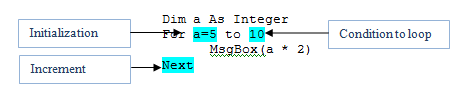 Dim a As Integer The for loop above is very simple and allows us to pick up the three main parts of repetition. These are highlighted below. The counter, a , is set initially to the value 5. The keyword next means that when the code gets here it is to step to the next iteration (or loop) and also increment the counter, a , by 1. Finally we keep going until the counter reaches 10. Understanding these three ideas are all you need to know in order to convert a loop. Below is the steps you must follow to perform the conversion -