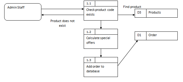 Internal processes can be split into multiple levels which allow extra detail to be looked at. Consider the process - This could be split down by looking at the validation. The above diagram shows that the add order process actual involves a number of steps, including a error response if a invalid product has been chosen. A new data source, products, has been added which could have been overlooked if the process had not been broken down. The numbering is very important here. Each process starts with the number 1.x to show it is the break down of process one. We call this a level 1 diagram. The original diagram is called a level 0 diagram. If we decided more detail was required for process 1.2 (Calculate special offers) then we would draw a level 2 diagram. The processes would then be numbered 1.2.1, 1.2.2, 1.2.3 and so on. |