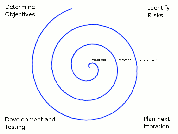 The basic premise of the spiral model is risk analysis and iterative development. The project first of all has its requirements worked out through analysis. Once this has been done the risks are then looked at. This is a critical part of the model as large scale projects require large scale finance. If the risk of the project is too great then the project should be aborted. If the project goes ahead then a prototype is produced. This prototype is then evaluated by both the customer and the developer and new requirements drawn up.