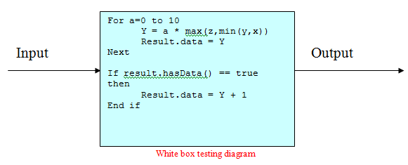 Above is a diagram of what white box testing looks like. White box or glass box testing is where the structure of the code is being tested. For example we might test to see if an IF statement is run etc. We are looking at the different paths through the code. Every time you have a control statement you effectively create a new path through the code. As such each path must be tested.