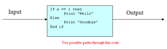 There are two possible paths through the code. If A equals one or if A does not equal one. In order to trigger the two paths the programmer would need to run two tests. Clearly this is a simple example. Code tends to have many different paths. In fact a program could have in excess of a billion different possible paths through it. As such testing every path through a system is impossible.