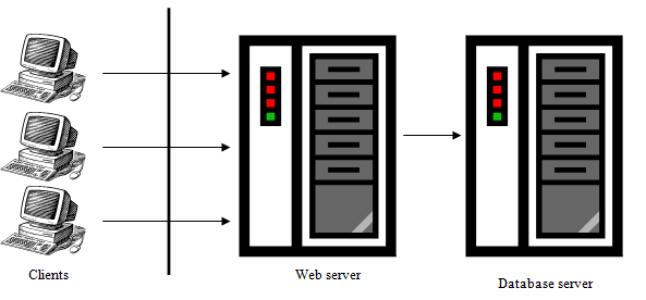 It is unusual not to rely on any other computers in order to perform a task. What is more usual is that different tasks are assigned to different servers. The print server will be one machine, a file server will be another and a web server maybe a third. This is done as a server can not service too many requests. If it does then it may start to slow down. Each request takes time and although servers tend to be very powerful computers, they do not have infinite resources. Eventually they will run out. Servers may need to talk to other servers in order to complete its task. Consider the situation where a web server requires access to a database stored on a separate machine. So the web server,in order to fulfil a request from the client, must access yet another server. This is known as a three tier architecture. The first tier is the client, the second is the web server and the third is the database server. It is possible to have four tier or even more, depending on the task which needs doing. |