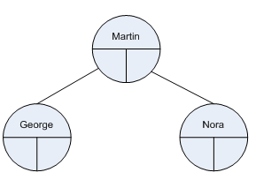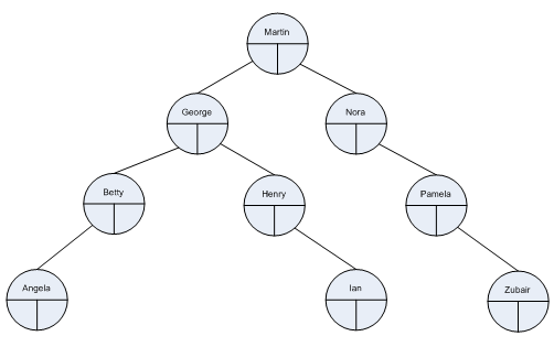 In this case there are two sub trees connected to Martin; George and Nora. Look carefully at the order of the nodes as it is important. Binary trees are only binary trees if the following rules hold –