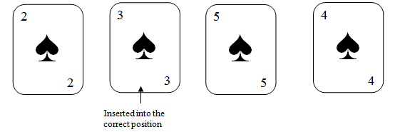 The next lowest card will then be removed and held in the right hand, the 3 of spades. This then gets inserted into the correct position in the left hand. Then finally, the next lowest is inserted into the correct position. This ends the algorithm as all cards are sorted. Looking at this real world situation we can start to come up with a basic algorithm to perform sorting. The left hand will be our partially sorted list while the right hand will be our temporary holding bay for a record. We then insert the record in the temporary bay into the correct position. However, scanning over the whole list in each iteration is wasteful for a computer. A hand of cards is easy to see the lowest just by glancing. However imagine if there were a million cards to look at. The process of finding the lowest would be a mission in it's own right. As such we must attack the problem in a slightly different way, however a lot of the principles which were used in the card example will still be used.