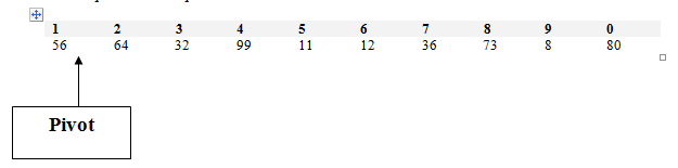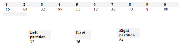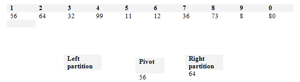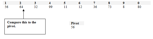 The best way to describe how quicksort works is through an example. Consider the list of numbers below. Step 1 - Choose a pivot The first element of the list will become the pivot. Step 2 - Order all elements of the partition You must pass over all of the numbers in the list. Any number less than the pivot should be placed on the left partition while all numbers greater of equal to the pivot should be placed on the right. 64 is greater than the pivot so should be placed to the right hand side. Next we compare 32 to the pivot. It is less so it is placed on the left partition