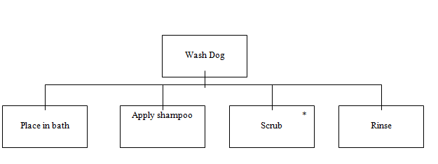 It is common to want to do activities, or fundamental operations, in a sequence. In fact imperative programming is based around the idea that code is run in a specific sequence. As such we need to show sequencing in JSP. Below is a simple, if rather silly, example. The diagram is read from left to right. In this case we place the dog in the bath, apply shampoo, scrub many times and then rinse. We could break each of these down further. A simple exercise is to think about what decisions might you need to make. For example what if the god struggles when you put him in the bath? |