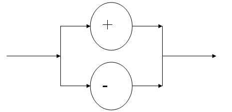The + and – are terminal symbols and as such we use the circle symbol. The two circle symbols are drawn on top of each other in order to show alternation. We read the diagram from left to right in the same direction as the arrows. Where the flow branches we have alternation. Conjunction is just as easy. Consider the following rule.